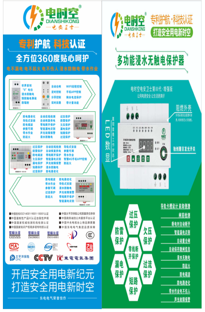 公司专业销售电时空(浸水防触电保护器)是根据用电安全标准设计、制造,该产品通过企业体系认证ISO9001、ISO8001、ISO4001.3C强电合格认证,国家权威部门监督检验合格,中央电视台ID:2049-8478-5005-0011播放,并由“中国太平洋财产保险股份有限公司”进行承保,现已投入国家电网、机关单位、企业、公共设施、家庭中使用,通过实践与用户反馈,该装置处于国、内外独创。解决了近百年来,用电恐惧的威胁。