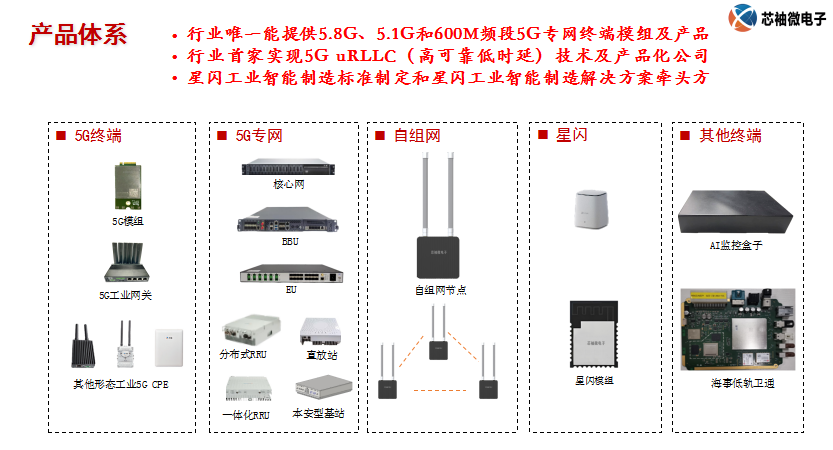 公司以5G无线通信技术为核心,通过自主研发的高可靠、低延时、大带宽和大覆盖的5G通信技术及产品,为客户提供行业领先的高性价比5G专网整体解决方案。