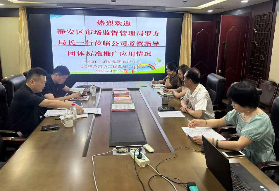 2025年8月26日上午,静安区市场监督管理局罗方副局长、标准计量科科长况飞龙莅临协会考察指导团体标准推广应用情况。协会会长、上海环宇消防集团公司董事长杜桂潭及秘书处在会议室作了热情接待。