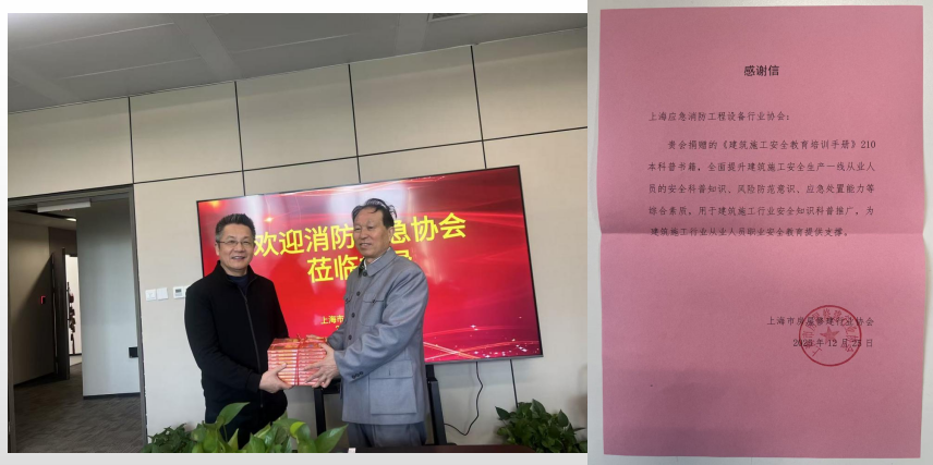 会上,陈建福秘书长对《建筑施工安全教育培训手册》赠书表示感谢并给予了感谢信,该科普系列丛书是为共同宣传推广建筑施工安全防范意识,提升综合应急处置能力提供教材。