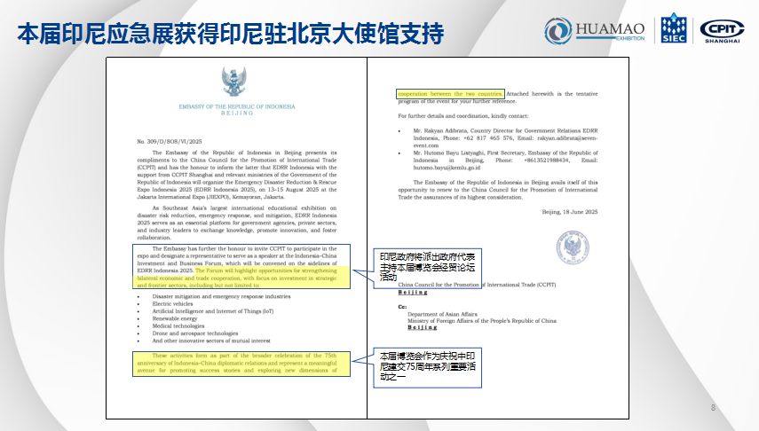 去年8月印尼应急展期间,协会组织上海赞瑞实业有限公司、上海丞士机器人有限公司等16家会员企业共同组团赴印尼参加展会,对协会支持长三角和印尼国际应急减灾和救援博览会一直以来做出的努力,得到了长三角和印尼展组委会的感谢信。今年市贸促会将联合协会共同组织推荐优秀的科技会员企业组团参加第三届印尼国际应急减灾和救援博览会,让更多先进的应急救援装备、新产品新技术走向一带一路国际市场。